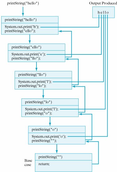 Note also the order in which things are done in this method. First s.charAt(0) is printed, and then s.substring(1) is passed to printString() in the recursion. This is a typical structure for a head-and-tail algorithm. What makes this work is that the tail is a smaller, self-similar version of the original structure.
