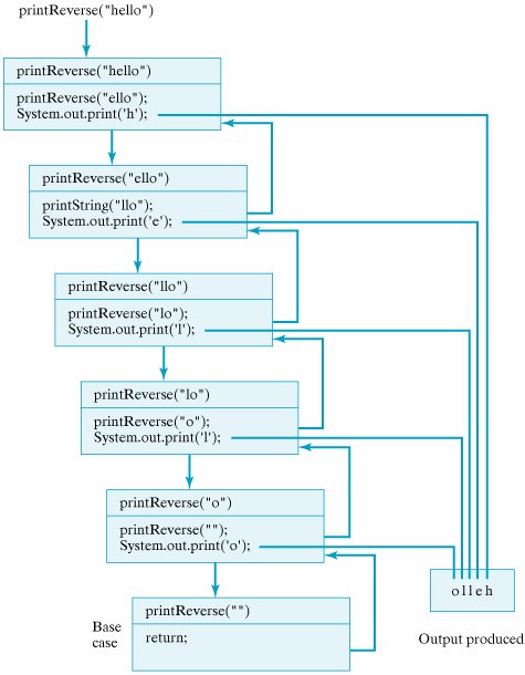 As its name suggests, this method will print the string in reverse order. The trace in Figure 12.7 shows how this works. Before printReverse("hello") can print h, it calls printReverse("ello") and must wait for that call to complete its execution and return. But printReverse("ello") calls printReverse("llo") and so must wait for that call to complete its execution and return.