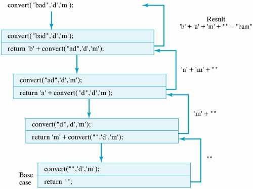 As in our previous string-processing methods, the limiting case in this problem is the empty string, and the recursive case will divide the string into its head and its tail. If the head is the character we want to replace, we concatenate its substitute with the result we obtain by recursively converting its tail.