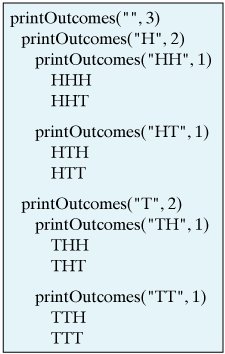 To translate this into Java code, we can create a class called CoinToss which has a single static method called printOutcomes(String str,int N). The above recursive description easily translates into code for the method in Figure 12.12.
