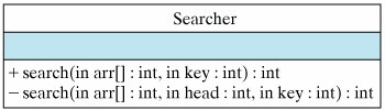 For this reason, it is customary to provide a nonrecursive interface to the recursive method. The interface hides the fact that a recursive algorithm is being used, but this is exactly the kind of implementation detail that should be hidden from the user. This is an example of the principle of information hiding introduced in Chapter 0. A more appropriate design would make the recursive method a private method called by the public method, as shown in Figure 12.17 and implemented in the Searcher class (Fig. 12.18).