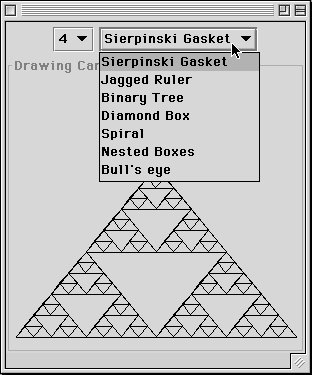 As a simple example, let's design an applet interface that can be used to display the fractal patterns we developed earlier. We want an interface that lets the user select from among the available patternswe'll use the Sierpinski gasket and nested boxes for starters. In addition, the user should also be able to select different levels for the drawings, from 0 to 9. We want to present these options in two menus, with one JComboBox for each menu.