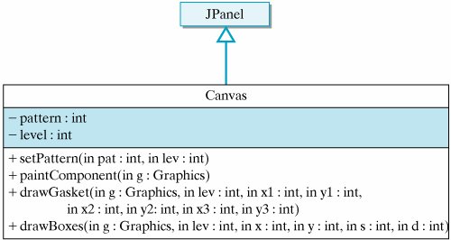 The actual drawing of the fractal patterns is handled by the canvas JPanel component. Its design is shown in Figure 12.32, and its implementation is given in Figure 12.33. All of the drawing is done in the paintComponent() method. Because the canvas is contained within the applet, the paintComponent() method is called automatically whenever the applet repaints itself. Note how the switch statement uses the pattern that the user chose to call the corresponding drawing method. You can see from this switch statement that a JComboBox's items are zero indexed.