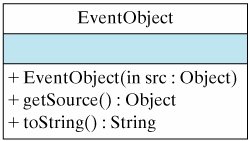 The methods used to handle the ActionEvent are derived from the java.util.EventObject class, the root class for all events (Fig. 13.8). Our example (Fig. 13.6) uses the get- Source() method to get a reference to the object that generated the event. To see what information is contained in an event object, we can use the toString() method to print a string representation of the event that was generated. Here's what it displays: