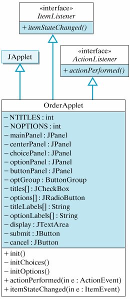 The design of the OrderApplet is summarized in Figure 13.29, and its complete implementation is given in Figure 13.30. There are several important points to make about this program. First, five JPanels are used to organize the components into logical and visual groupings. This conforms to the design shown in Figure 13.25.