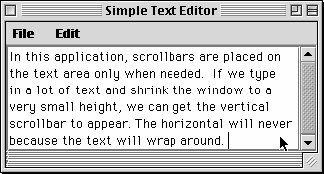 The two integers refer to the vertical and horizontal scrolling policies. These cover properties such as whether the scrollbars are always present or just as needed. The default policy is to attach scrollbars to the component only when needed. Thus, to see the scrollbars in the SimpleTextEditor, you would have to shrink the window to the point where all of the text cannot be viewed (Fig. 13.34). Because the text area in this example is wrapping the text, the horizontal scrollbar will never be needed.