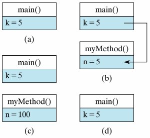 public class PrimitiveCall { public static void myMethod(int n) { System.out.println("myMethod: n= " + n); n = 100; System.out.println("myMethod: n= " + n); } // myMethod() public static void main(String argv[]) { int k = 5; System.out.println("main: k= " + k); myMethod(k); System.out.println("main: k= " + k); } // main() } // PrimitiveCall class |
