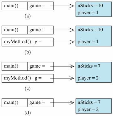For example, consider the ReferenceCall class (Fig. 3.9). In this case, myMethod() takes a parameter g of type OneRowNim. Because a OneRowNim instance is an object, g is a reference variable. So when myMethod(game) is invoked in main(), a reference to game is passed to myMethod(). Note that in myMethod(), we use takeSticks(3) to change the number of sticks of g from 10 to 7, and this change persists even after the method returns control to main(). The reason is that during the method's execution, both game and g refer to the exact same object (see Fig. 3.10). The output generated by ReferenceCall would be