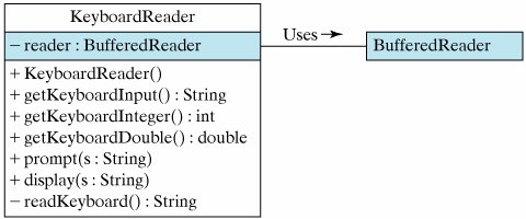 Figure 4.6 presents the design of KeyboardReader class. Note that instances of this class will use a BufferedReader object to perform the actual keyboard input. That is why we need a private instance variable of type BufferedReader. The constructor method will create a BufferedReader, which will then be used whenever a read operation is requested. The KeyboardReader class has five public methods. The getKeyboardInput() method returns a String. This is the method we will call when we just want to get the string the user typed from the keyboard. The getKeyboardInteger() method returns an int value. This is the method we will call when we want an integer from the keyboard. Similarly, the getKeyboardDouble() method returns a double. This is the method we will call when we want to input a floating-point value from the keyboard. Finally, the prompt() and display() methods will be used to perform two other important tasks of a user interface: prompting the user and displaying the program's output.
