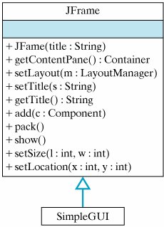 The constructor method illustrates how to use some of the methods inherited from JFrame. Figure 4.14 shows some of the methods that SimpleGUI inherits from JFrame. We use the setSize() and setLocation() methods to set SimpleGUI's size and location. We use the setTitle() method to set its title. And we use the setVisible() method to cause it to appear on the console.