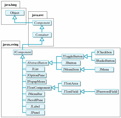Event-driven programming Since this is our first look at some complex topics, we will keep the discussion as simple as possible. We will delay discussion of certain issues that will be taken up in more depth in Chapter 13. 4.4.1. Java's GUI ComponentsThe Java library comes with two separate but interrelated packages of GUI components, the older java.awt package and the newer javax.swing package. For the most part, the Swing classes supersede the AWT classes. For example, the java.awt.Button class is superseded by the javax.swing.JButton class, and the java.awt.TextField class is superseded by the javax.swing.JTextField class. As these examples show, the newer Swing components add an initial J to the names of their corresponding AWT counterparts. Figure 4.10 illustrates how some of the main components appear in a GUI interface. As can be seen, a JLabel is simply a string of text displayed on the GUI, used here as a prompt. A JTextField is an input element that can hold a single line of text. In this case, the user has input his name. A JTextArea is an output component that can display multiple lines of text. In this example, it displays a simple greeting. A JButton is a labeled control element, which is an element that allows the user to control the interaction with the program. In this example, the user will be greeted by the name input into the JTextField whenever the JButton is clicked. As we will learn, clicking on the JButton causes an event to occur, which leads the program to take the action of displaying the greeting. Finally, all of these components are contained in a JFrame, which is a top-level container. A container is a GUI component that can contain other GUI components. Figure 4.10. Various GUI components from the javax.swing package. The Swing classes are generally considered to be superior to their AWT counterparts. For one thing, Swing components use a sophisticated object-oriented design known as the model-view-controller (MVC) architecture. This gives them much greater functionality than their AWT counterparts. For example, whereas an AWT Button can only have a string as its label, a Swing JButton can use an image as a label. (See Chapter 13 for a detailed discussion of the MVC architecture.)