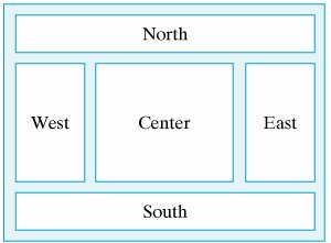 The particular add() method to use depends on how we want to arrange the components in the container. The layout of a container is controlled by its default layout manager, an object associated with the container that determines the sizing and arrangement of its contained components. For a content pane, the default layout manager is a BorderLayout. This is an arrangement whereby components may be placed in the center of the pane and along its north, south, east, and west borders (Fig. 4.17).