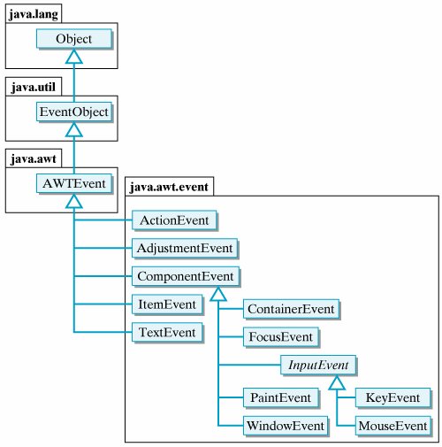 Figure 4.19 shows some of the main types of events in the java.awt.event package. In most cases, the names of the event classes are suggestive of their roles. Thus, a MouseEvent occurs when the mouse is moved. A KeyEvent occurs when the keyboard is used. The only event that our program needs to listen for is an ActionEvent, the type of event that occurs when the user clicks the JButton.
