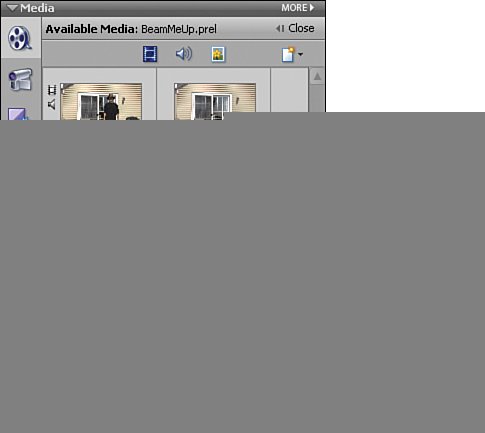 | We'll create a color matte now that will serve two purposes. First, it will color our transporter beam a bright white, which will give it a bright light look. Second, it will, once we apply the matte effect in the next task, act as a color matte and allow the transport beam to show through on top of the still image by making all of the black in the transporterbeam.avi clip act as a transparent color. Create a Matte and Color it White Click on the New Item button in the Media panel.