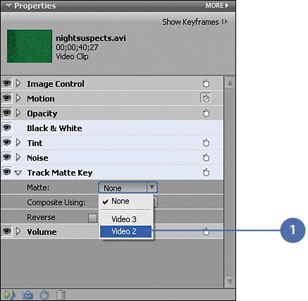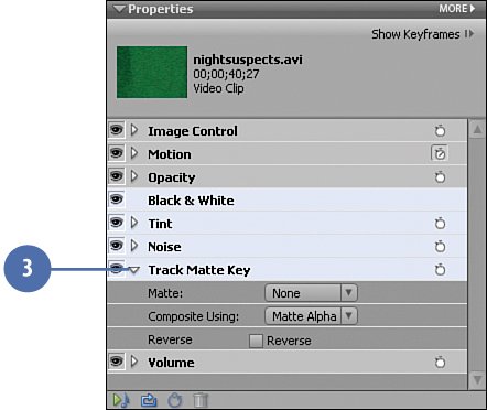 With the nightsuspects.avi clip selected, access the Properties panel and click on the triangle next to the Track Matte Key effect to reveal the effect's controls.