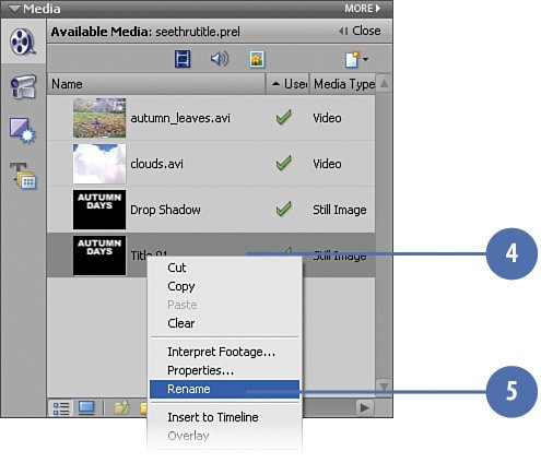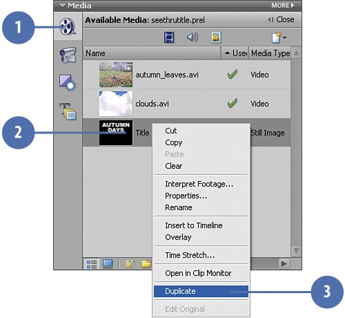 Select the duplicate clip, Title 01 Copy, in the Available Media view and right-click on the clip.