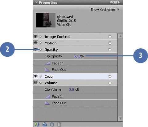 Adjusting the Opacity of the "Ghost" Clip Right now, both of our clips have the same opacity; that is, both are "normal." For the Friendly Ghost Effect to work, however, our "ghost" clip needs to be faded out so that the actor playing the part of the spirit will appear to be see-through. To achieve this effect, we'll simply adjust the Opacity setting for the clip to less than 50%. A good setting for our purposes is 25%, but you can adjust this to your preferences. In addition, you can choose to adjust the opacity directly on the Timeline using the Opacity rubberband, or on the Properties panel. The instructions here cover using the Properties panel. Make the Ghost Clip "See Through" Click on the ghost-avi clip in the Video 2 track, if not already selected.