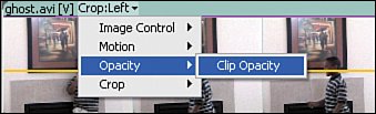 Tip You can type 50 directly into this field. Did You Know? You can use the yellow rubberband to control opacity. You can use the yellow rubberband that runs the length of every video clip to set opacity. Be sure that the rubberband is controlling opacity (see the second Did You Know? below). Then click on the rubberband. With the mouse button held down the cursor changes to include small up and down arrows. Drag the rubberband down to decrease opacity, up to increase it. As you move the rubberband, Premiere Elements displays a small yellow box to show you the opacity amount. You can choose what the rubberband controls. By default, the rubberband controls opacity, but you can set it to control other effects. To do so, click on the settings menu control in name bar at the top of the clip. It only appears at the head, or front, of the clip, so if you don't see it, scrub to the beginning of the clip. From the menu, select Opacity, Clip Opacity, as shown below.  |