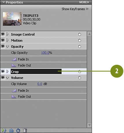 Just as we did for TRIPLET3, in the Properties panel for TRIPLET2, click the Crop Effect name bar to select it.