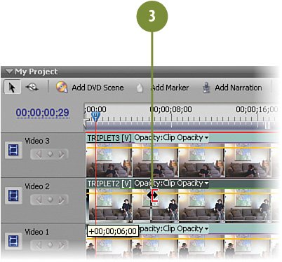 Note We're working with the sample clips here, of course. In the footage that you take, the degree of adjustment you'll need to make may be far greater or far less. Select the clip, TRIPLET3 in the track, Video 3. This triplet also has a bit of a delay before he beings "interacting" that makes it seem as if he just wasn't listening to the conversation. We need to fix that so that he joins in in a natural way. As you did with the TRIPLET2 clip, drag the head of the TRIPLET3 clip forward six seconds (+00;00;06;00).