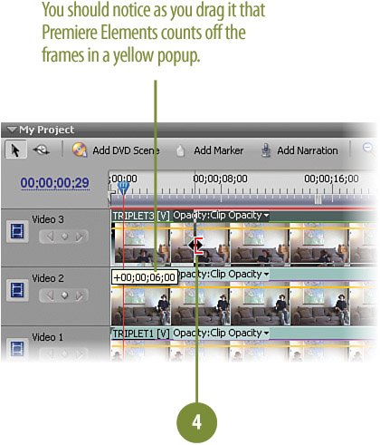 Note The scale of the timeruler changes as you change the zoom level. You'll notice that once you have zoomed in all the way, each "tic" on the timeruler now represents a single frame. There's an unnatural-feeling pause here after triplet # 1 has finished talking and triplet # 2 begins talking. So, we want to trim the first few seconds of this clip. Therefore, select the clip, TRIPLET2, in the track, Video 2, and drag the front (head) of this clip forward six seconds (+00;00;06;00); that is, drag the head of the clip to the right.