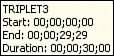 Note The clips are now lined up visually on the Timeline, indicating that they are all the same duration; that is they start at the same time and end at the same time. Did You Know? You can learn a lot about a clip simply by hanging around. If you want to know how long a given clip on the Timeline is (its duration), where it starts and where it ends (in timecode format, that is: hh;mm;ss;ff), just hover your mouse over it for a second or two. A yellow popup appears (as shown here) telling you just that! For example, here's the popup for the TRIPLET3 clip:  |