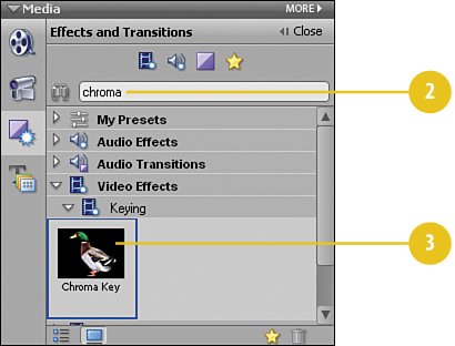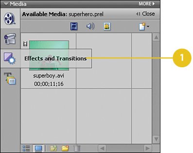 | Here we'll "clean the green" background from the superboy.avi clip. Because of the way that this particular greenscreen clip was filmed, it's a bit problematic. There are what are known as "hot spots"(places in the background on which light shown brightly) and shadows. The more uniform the green color is in your greenscreen clips, the more successful the Chroma Key effect will be when applied. Shadows and "hot spots" effectively create such variations on the green-screen color that they are practically completely different shades of green and are very difficult to remove. But we have a solution... Apply the Chroma Key On the Media panel, click the Effects and Transitions button to switch to the Effects and Transitions view.