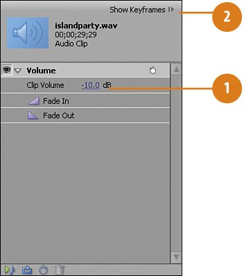 Tip Click the triangle to twirl open the volume controls, if they aren't already visible. Click the Show Keyframes button.