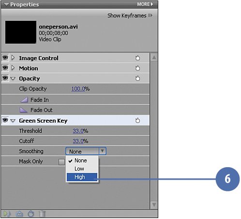 Tip If the oneperson.avi clip is not currently displayed in the Monitor window, move the CTI along the Timeline until it does. On the Properties panel, set the following Green Screen Key properties: