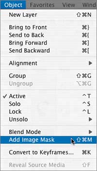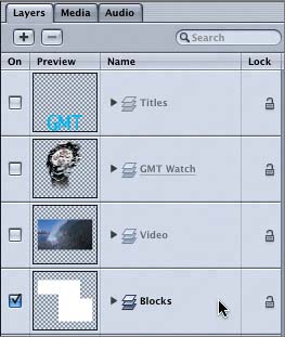 | Applying an Image Mask to a Layer The goal in this exercise is to use the Blocks layer as an image mask for the Video layer. The black areas between the white blocks in the Canvas are transparent areas, or the alpha channel for the Blocks layer. Using an image mask, you can apply the same alpha channel information to the Video layer. Then the Video layer will have the same black transparent areas as the Blocks layer. You apply an image mask to a layer in either of two ways: Let's use the Object menu method. 1. | Press D to open the Dashboard, if it's not already open.