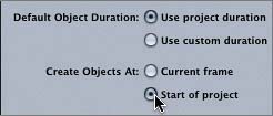 | 2. | In the Preferences window, in the Still Images & Objects area, change the Create Objects At setting to Start of project.