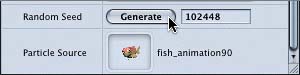 | Changing the Random Seed The Motion Particle generator creates particles using random sequences of values based on the other parameters applied to the particle. Each set of random values selected by the generator has a number called the random seed. If you don't like the random pattern or behavior that has been applied to the particles, you can click the Generate button to create a different random seed number. The new number will change the behavior pattern to a different variation. The Generate button is located near the bottom of the Emitter tab.  The Random Seed value is located in the field to the right of the Generate button. When you click the Generate button, the Random Seed number changes in the field, and the random behavior of the particles changes to reflect a new random sequence of values. Changing the random seed does not change absolute values that you have applied to the particles. However, it does change the range values and any parameters that rely on randomly generated numbers. Let's change the random seed for the particles until you like the way the school of fish looks. 1. | On the Emitter tab, for the Random Seed parameter, click the Generate button to change the random seed.