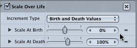 The Scale Over Life parameters on the Behaviors tab change to include Scale At Birth and Scale At Death parameters.