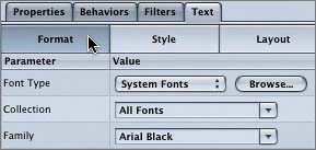 | The Text tab in the Inspector has three text control panes: Format, Style, and Layout. Each pane has a corresponding button located on the Text tab. Let's look at the Text tab panes before we modify the look of the FRANCES text object. 1. | Press Cmd-4 to open the Layers tab.