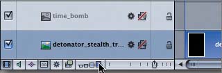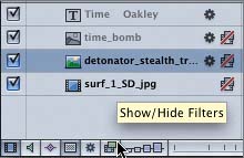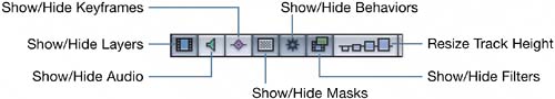 Any filters that were showing in the Timeline are now hidden. Also, notice that the disclosure triangles for the objects in the project are now hidden. Why? Because if you hide all of the behaviors and filters, there isn't anything for the disclosure triangles to disclose. Don't worry; the disclosure triangles will return later in this lesson when you show the behaviors and filters again.