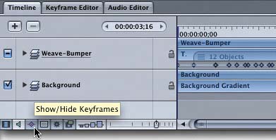 | 5. | Click the Show/Hide Keyframes button at the bottom of the Timeline tab to hide the keyframes in the Timeline.