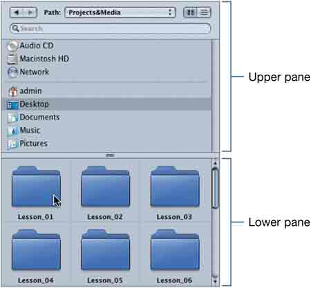 | 3. | In the lower pane, double-click the MOTION_INTRO Book Files folder to open it. Then double-click the Lesson_01 folder to open it in the lower pane of the File Browser.
