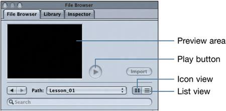 | Changing the File View Now that you have opened the Lesson_01 folder in the lower pane of the File Browser, let's take a look at the different ways that you can view your files.  The Motion File Browser allows you to view your files in either List or Icon view. To change the way you view your files, you simply click the appropriate view button. Once you've changed to either List or Icon view, the Motion Browser will remain that way until you change it again. The Utility window, including the File Browser and view selection, is part of Motion, not specific to a particular project. Therefore, whichever view is selected when you quit Motion will be the default when you relaunch the program. Let's modify the file view in the File Browser. The previous task showed the files displayed in the Icon view, so let's switch to the List view. 1. | At the middle right of the File Browser, click the List view button.