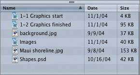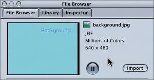 | Previewing Files in the File Browser With your files displayed in the bottom pane, you can easily preview any of them in the Preview area at the top of the File Browser. To preview a file in Motion, you simply click the file icon to select it. You can preview a file in either the List view or the Icon view. 1. | Locate the file called background.jpg and click to select it.