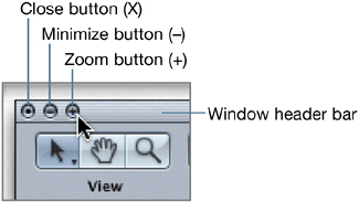 | The Canvas window is the interactive, hands-on creative environment where you'll be dragging, dropping, resizing, modifying, moving, tweaking, previewing, and adding effects and filters to the various objects in your project. Let's take a quick tour of the Canvas window. Toolbar Use the buttons to show and hide the interface components, transform objects, add effects, and change the view of your composite. Canvas Add files, view and modify the objects in your composite, and use the transport controls to easily navigate and preview your project. Current Frame and Project Duration fields Display the current location of the playhead and the project duration in either frame or timecode increments. Transport controls Use to play or scrub through your project and enable keyframing and audio playback. You'll learn more about these in Lesson 2. Mini-Timeline Use to add, move, and trim objects within your project without having to open the Timing pane, which contains the full Timeline. Adjusting the Window Since the Canvas window is essentially your creative workstation, you should be sure that you understand how to adjust it before you dive into the creative process. Motion was designed for Macintosh OS X, and the Canvas window works the same as other OS X windows do. If you're new to the Mac or to OS X, follow these steps to get some practice zooming, moving, and minimizing the Canvas window. If you're already a master at Mac OS X window features, feel free to skip this exercise. There are three buttons in the upper-left corner of the Canvas window:Close (X), Minimize (), and Zoom (+). 1. | Click the Zoom button (+) to zoom the Canvas window so it fills your computer screen.