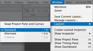 NOTE You can also double-click the header at the top of the Canvas window to minimize and hide the window. If you click the Close button (X), you will close the actual project and will need to open it again from the File menu. | Changing the Window Layouts Now let's go back to the standard window layout. One way to change the layout is with the Window menu. 1. | Choose Window > Layouts > Standard to reset the windows to the standard layout.