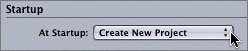 | Understanding the General Preferences The General preferences pane is exactly what its name suggests: It provides settings that apply globally to all aspects of Motion. The General preferences are Startup, Interface, File Browser & Library, Memory & Cache, LiveFonts, and 3rd Party Plug-ins. Startup Allows you to choose Motion's first action when the application opens. The pop-up menu offers these choices: Open Last Project(s), Create New Project, Show Welcome Screen, and Browse Templates.