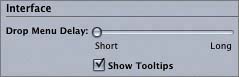 Interface Allows you to set some general options for the interface with the Drop Menu Delay slider and the Show Tooltips check box.