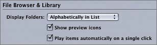 Tooltips are those handy yellow boxes that pop up to tell you what an item is when you hover your pointer over it.  The Drop Menu Delay slider controls the drop menus, such as the ones you see when you drag media to the Timeline. You can use this slider control to determine the length of wait time between when you drag media files to the project and when the drop menu appears. File Browser & Library Determines how the Utility window displays the content within the File Browser and the Library.  The "Play items automatically on a single click" check box controls whether the Preview area plays the selected contents automatically. Memory & Cache Controls the amount of your computer's memory that you allocate to Motion. A larger percentage means less memory that will be available for other applications.