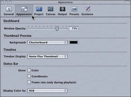 LiveFonts Determines how Motion stores LiveFonts. 3rd Party Plug-ins Allows you to point to a folder on your hard disk where you store third-party plug-ins, such as After Effectscompatible plug-ins. Working with the Appearance Preferences The Appearance preferences control Motion's visual elements: the Dashboard, the thumbnail preview, the Timeline, and the Status Bar. Let's take an interactive look at these preference settings.  1. | Click the Appearance button at the top of the Preferences window to open the Appearance pane.