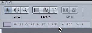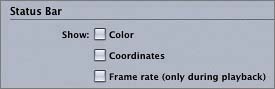 | Viewing the Status Bar The last controls that we're going to explore in the Appearance pane constitute the Status Bar. This isn't the name of a hip nightclub where particles hang out and exchange behaviors. The Status Bar is a display that you can turn on above the Canvas. The Status Bar consists of check boxes to show color, coordinates, and the frame rate during playback.  1. | Check all three of the Status Bar Show check boxes: Color, Coordinates, and Frame rate (only during playback).