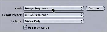 Image sequences use the same variety of file formats as still image files, including SGI, BMP, JPEG, TIFF, and TGA. Many of these support alpha channels, which Motion uses automatically. The Kind pop-up menu offers two choices: PICT and TGA. To specify the type of PICT file you want to export, click the Options button to open the Export Options window and change the export compression type for the image sequence. For now, we'll use the TGA preset.