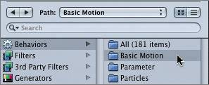 | Previewing a Behavior in the Library The icon for behaviors in Motion is a gear, because behaviors represent a mechanical part, or movement. The Basic Motion behaviors are located in the Library; these are basic behaviors that are commonly used in motion graphics. Let's go to the Library and find the Basic Motion behaviors. 1. | Click the Library tab, or press Cmd-2, to open the Library pane.