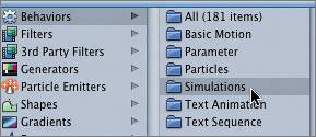| Working with a Simulation Behavior As you can see, basic behaviors are very easy to apply and adjust. There are also Simulation behaviors that use complex mathematical physics and geometry to simulate acts of nature such as gravity, wind, and orbit. Once again, Motion takes care of the calculations; all you need to do is apply the behavior and adjust it in the Dashboard. To make an object bounce off the edges of the screen, you use a Simulation behavior called Edge Collision. When the yellow circle collides with an edge of the frame, it will bounce off in a different direction. How far it bounces is based on how hard (fast) you throw the object against the edge of the frame. Let's add an Edge Collision behavior so the yellow circle bounces off the left and bottom edges of the screen, sending it back out the way it came in, from frame right. 1. | Click the Simulations folder in the right column of the upper pane in the Library.