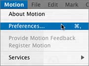 | Now that you've seen the finished project, let's create it. In the previous lessons, you opened projects that I had prepared for you in advance. This time, you'll create a project yourself. Setting the Project Preset One of the first steps in creating a new project is to decide what type of project you'll be creating. You can select the type of project from the list of presets in the Preferences window. This project you're creating is the introduction for a digital video promo that will be edited in Final Cut Pro. Let's open the Preferences window and select the DV preset for the new project. There are three simple ways to open the Motion Preferences window: For this exercise, you'll use the most common method: You'll choose Motion from the Preferences menu. 1. | Choose Motion > Preferences.
